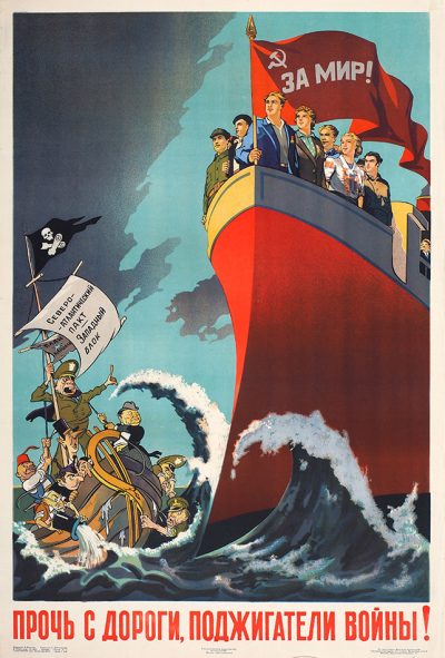 Soviet poster (1949). The red flag reads: “For Peace.” The white flag reads: “North Atlantic Treaty.” Caption: “Get out of the way, warmongers!”