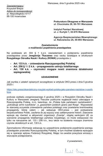 „Zawiadamiam PK oraz ABW o przestępczej działalności Rosyjskiego Ośrodka Nauki i Kultury w Warszawie. Jak ujawnił portal @oko_press wczoraj „gościł” tam Jewgienij Tkaczew,który szerzył kłamstwa na temat Polski. Naruszył on co najmniej kilka paragrafów Kk. Jeśli ta instytucja z siedzibą w samym centrum stolicy ma być tubą propagandową Kremla natychmiast powinny zająć się nią służby i śledczy. Putinowcy, precz z Warszawy!” – poinformował na X.