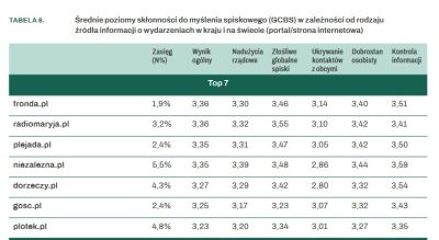 Najwyższy ogólny wskaźnik przekonań spiskowych odnotowano wśród odbiorców portali o profilu konserwatywno-religijnym, takich jak