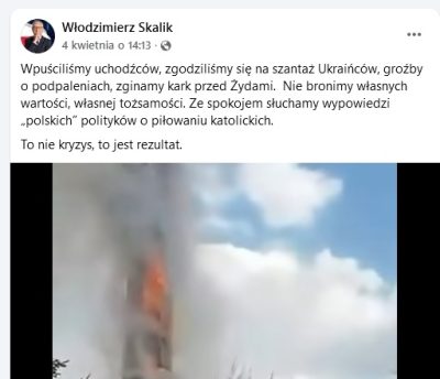 - Wpuściliśmy uchodźców, zgodziliśmy się na szantaż Ukraińców, groźby o podpaleniach, zginamy kark przed Żydami. Nie bronimy własnych wartości, własnej tożsamości - tak skomentował spłonięcie 25-metrowego krzyża papieskiego, stojącego przed warszawskim kościołem św. Maksymiliana Marii Kolbego. Policja ma na ten temat inne zdanie.