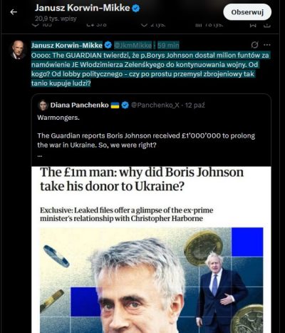 Teraz Janusz-Korwin-Mikke rozpowszechnił kolejny rosyjski fejk. „Oooo: The GUARDIAN twierdzi, że p.Borys Johnson dostał milion funtów za namówienie JE Włodzimierza Zełenśkyego do kontynuowania wojny. Od kogo? Od lobby politycznego – czy po prostu przemysł zbrojeniowy tak tanio kupuje ludzi?” – napisał na X i dołączył post pochodzącej z Ukrainy a teraz mieszkającej w Dubaju rosyjskiej dezinformatorki Diany Panchenko.