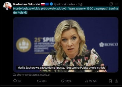 „Hordy bolszewickie próbowały zdobyć Warszawę w 1920 z sympatii Lenina do Polski?” – skomentował celnie wywody Zacharowej Radosław Sikorski na X.